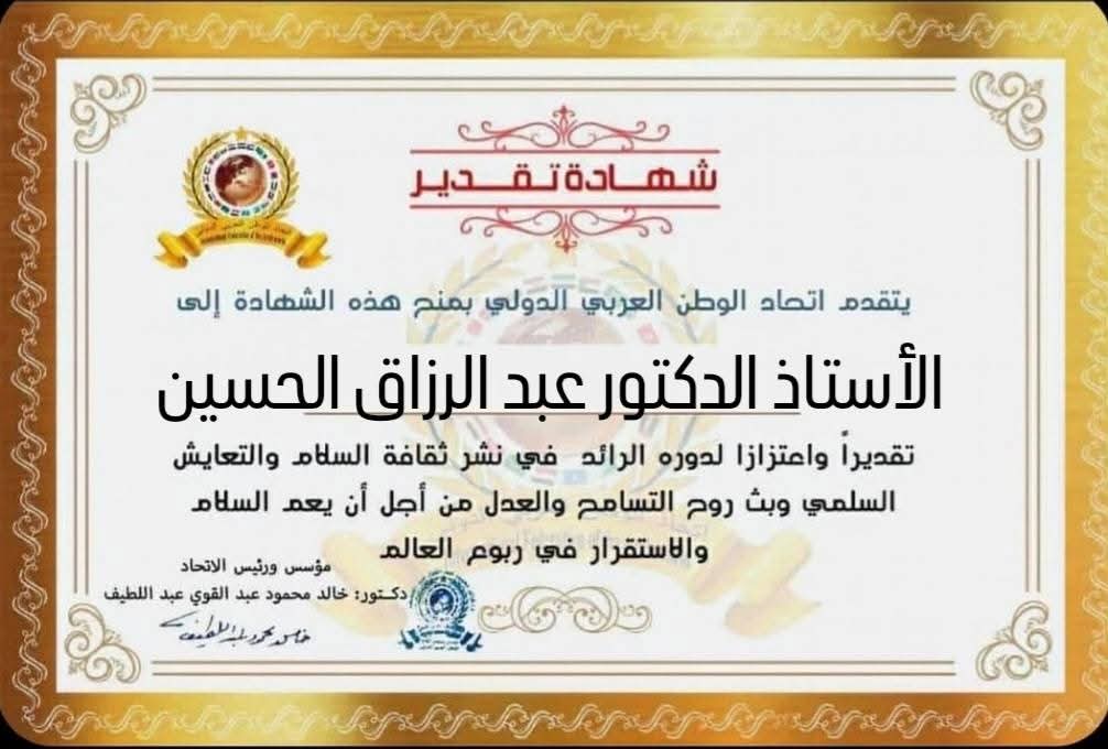 مؤسس ورئيس اتحاد الوطن العربي الدولي يمنح شهادة تقدير للأستاذ الدكتور عبد الرزاق الحسين رئيس الجامعة السورية الخاصةitihadworld11/01/2026تكريمات