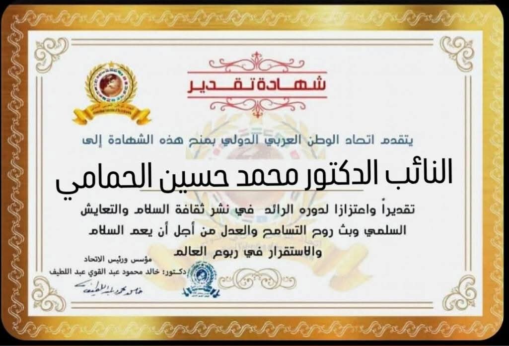 مؤسس ورئيس اتحاد الوطن العربي الدولي يمنح شهادة تقدير للنائب الدكتور محمد حسين الحماميitihadworld11/01/2026تكريمات