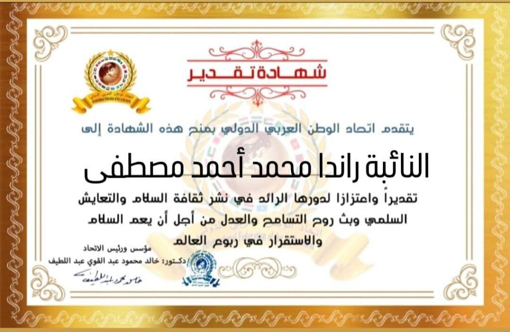 مؤسس ورئيس اتحاد الوطن العربي الدولي يمنح شهادة تقدير للنائبة راندا محمد أحمد مصطفى عضوة مجلس النواب المصري بالتعيين بقرار رئيس الجمهورية