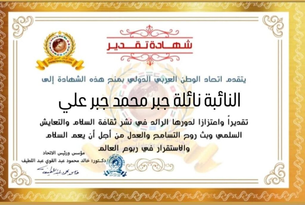 مؤسس ورئيس اتحاد الوطن العربي الدولي يمنح شهادة تقدير للنائبة نائلة جبر محمد جبر علي عضوة مجلس النواب المصري بالتعيين بقرار رئيس الجمهورية