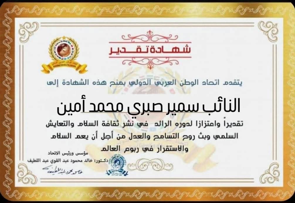 مؤسس ورئيس اتحاد الوطن العربي الدولي يمنح شهادة تقدير للنائب سمير صبري محمد أمين عضو مجلس النواب المصري بالتعيين بقرار رئيس الجمهوريةitihadworld12/01/2026تكريمات