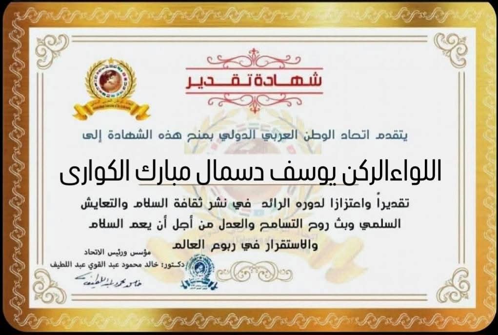 مؤسس ورئيس اتحاد الوطن العربي الدولي يمنح شهادة تقدير للواء الركن يوسف دسمال مبارك الكوارى رئيس الاتحاد العربي للرياضة العسكريةitihadworld12/01/2026تكريمات