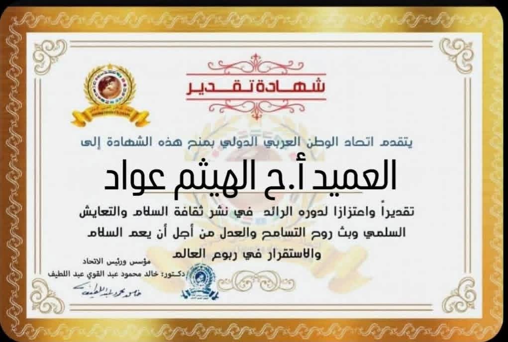 مؤسس ورئيس اتحاد الوطن العربي الدولي يمنح شهادة تقدير للعميد أركان حرب الهيثم عواد المستشار العسكري لمحافظة الدقهليةitihadworld12/01/2026تكريمات