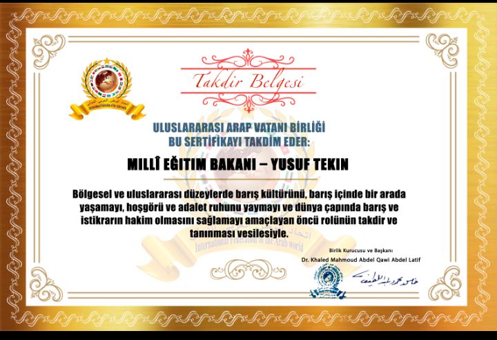 مؤسس ورئيس اتحاد الوطن العربي الدولي الدكتور خالد محمود عبد القوي عبد اللطيف يمنح شهادة فخرية للسيد وزير ا لتربية الوطنية يوسف تكينitihadworld21/12/2025تكريمات
