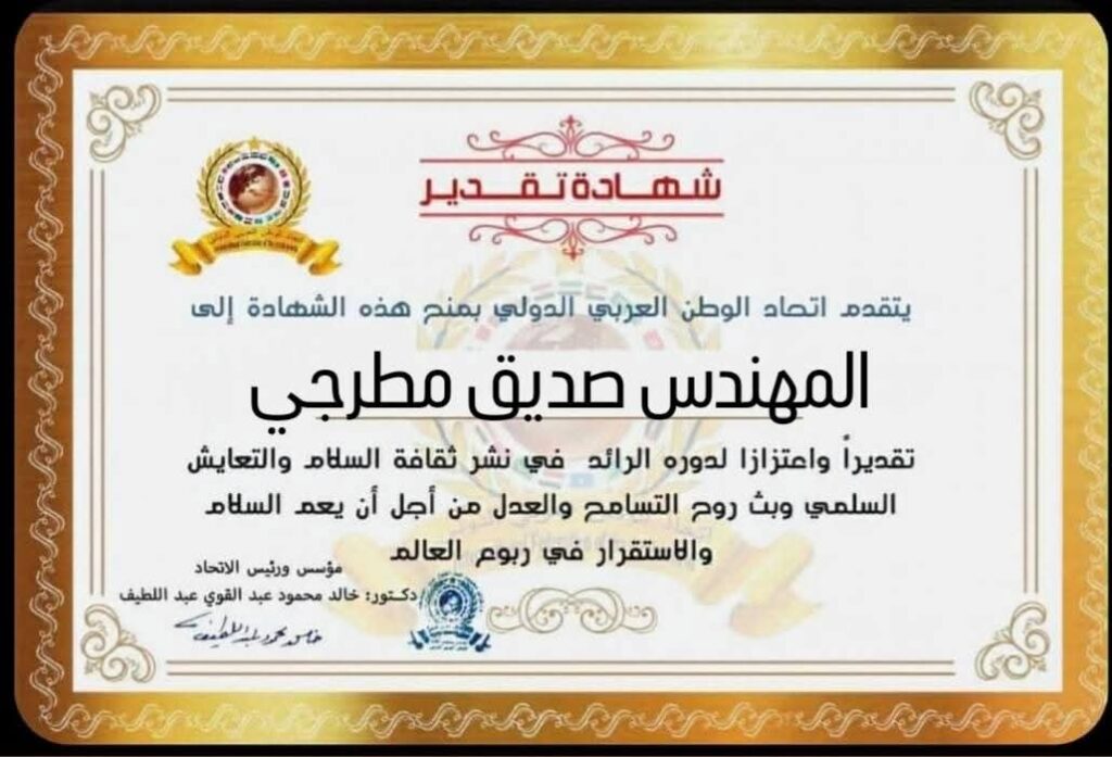مؤسس ورئيس اتحاد الوطن العربي الدولي يمنح شهادة تقدير للمهندس صديق مطرجي رئيس فرع نقابة المهندسين باللاذقية بالجمهورية العربية السوريةitihadworld13/01/2026تكريمات