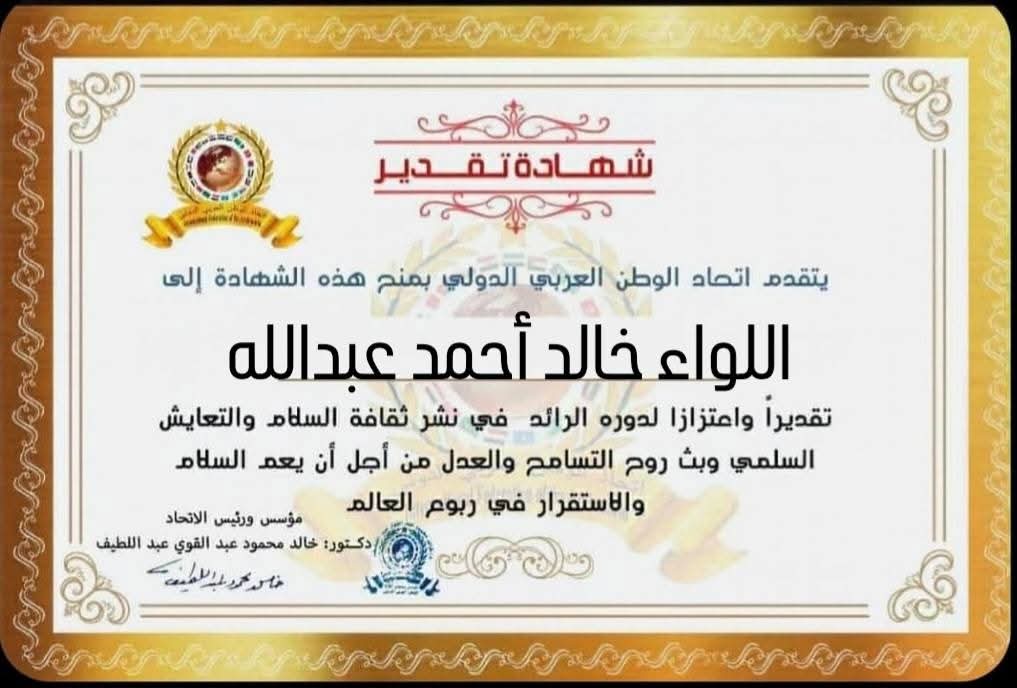 مؤسس ورئيس اتحاد الوطن العربي الدولي يمنح شهادة تقدير للواء خالد أحمد عبدالله رئيس هيئة الشؤون المالية للقوات المسلحة بجمهورية مصر العربيةitihadworld13/01/2026تكريمات