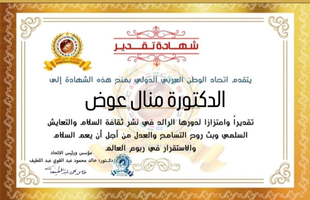 مؤسس ورئيس اتحاد الوطن العربي الدولي يمنح شهادة تقدير للدكتورة منال عوض وزيرة التنمية المحلية بجمهورية مصر العربية