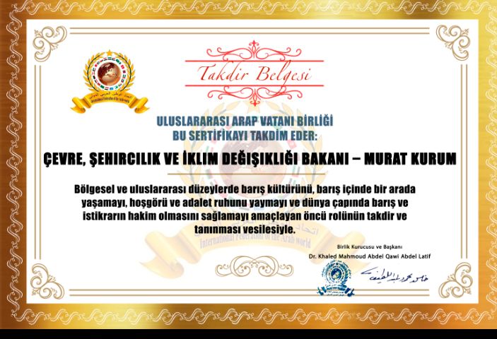 مؤسس ورئيس اتحاد الوطن العربي الدولي الدكتور خالد محمود عبد القوي عبد اللطيف يمنح شهادة فخرية للسيد وزير البيئة والتخطيط العمراني والتغير المناخي مراد كوردم في الجمهورية التركيةitihadworld21/12/2025تكريمات