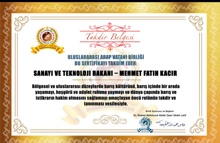 مؤسس ورئيس اتحاد الوطن العربي الدولي الدكتور خالد محمود عبد القوي عبد اللطيف يمنح شهادة فخرية للسيد وزير الصناعة والتكنولوجيا محمد فاتح فاجر في الجمهورية التركيةitihadworld21/12/2025تكريمات