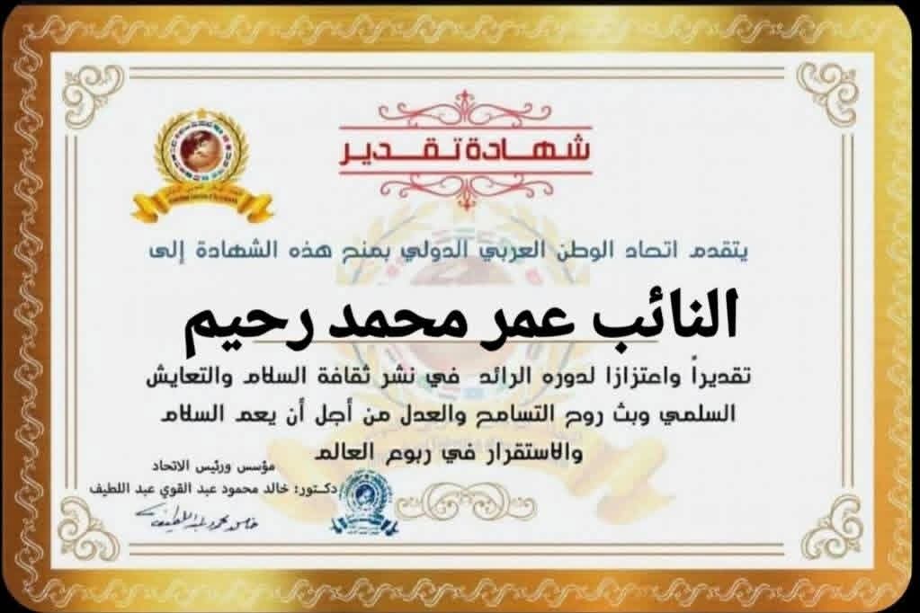 مؤسس ورئيس اتحاد الوطن العربي الدولي يمنح شهادة تقدير للنائب عمر محمد عمر محمد رحيم عضو مجلس النواب عن محافظة القاهرة الدائرة الثالثةitihadworld25/12/2025تكريمات