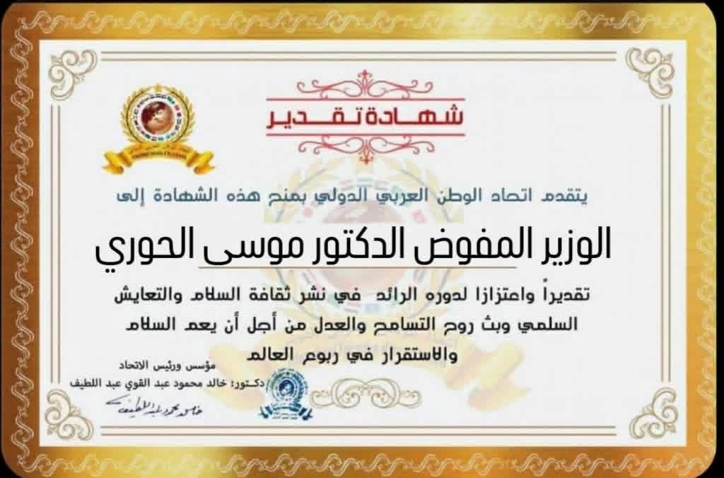 مؤسس ورئيس اتحاد الوطن العربي الدولي يمنح شهادة تقدير للوزير المفوض الدكتور موسى الحوري مدير معهد المخطوطات العربية بجامعة الدول العربيةitihadworld17/01/2026تكريمات