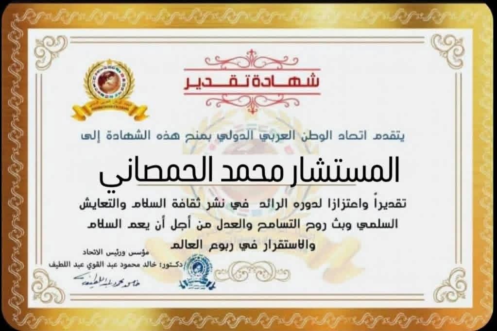 مؤسس ورئيس اتحاد الوطن العربي الدولي يمنح شهادة تقدير للمستشار محمد الحمصاني رئيس مجلس الوزراء المصريitihadworld19/01/2026تكريمات