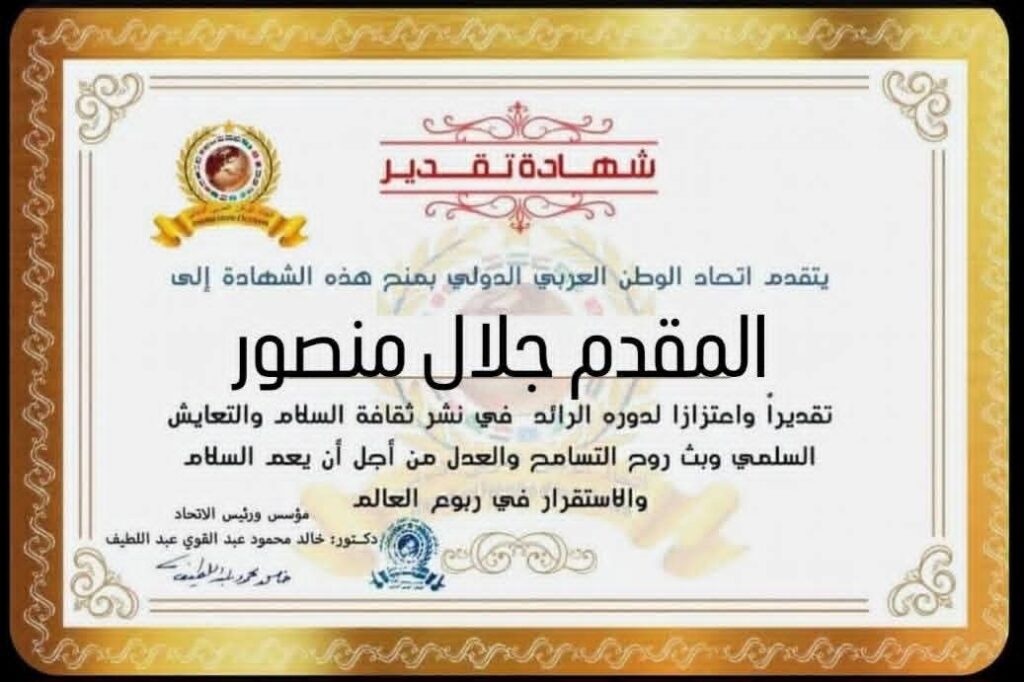 مؤسس ورئيس اتحاد الوطن العربي الدولي يمنح شهادة تقدير للمقدم جلال منصور رئيس مباحث قسم الدخيلة بمديرية آمن الإسكندرية بوزارة الداخلية من جمهورية مصر العربيةitihadworld20/01/2026تكريمات