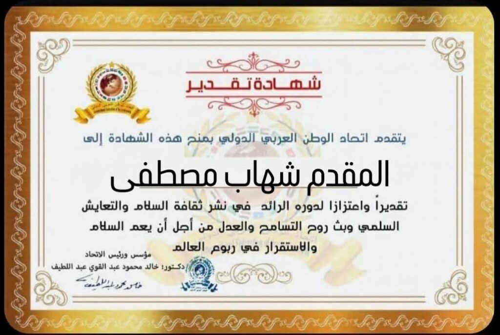 مؤسس ورئيس اتحاد الوطن العربي الدولي يمنح شهادة تقدير للمقدم شهاب مصطفى رئيس مباحث المنتزه أول مديرية أمن الإسكندرية بوزارة الداخلية من جمهورية مصر العربية