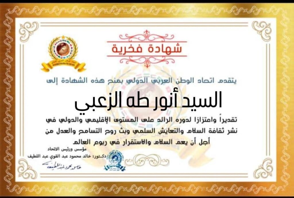مؤسس ورئيس اتحاد الوطن العربي الدولي يمنح شهادة تقديرللسيد أنور طه الزعبي محافظ درعا بالجمهورية العربية السورية