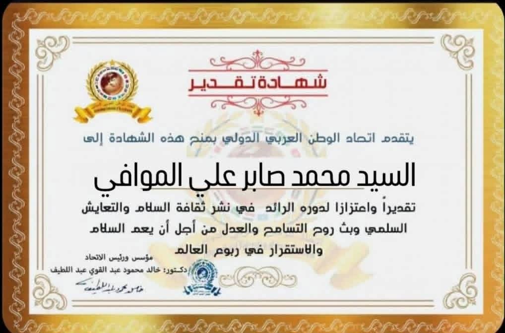 مؤسس ورئيس اتحاد الوطن العربي الدولي يمنح شهادة تقدير للسيد محمد صابر علي الموافي رئيس مجلس ادارة الإتحاد الوطني للقيادات الشبابية بوزارة الشباب والرياضة بجمهورية مصر العربيةitihadworld20/01/2026تكريمات