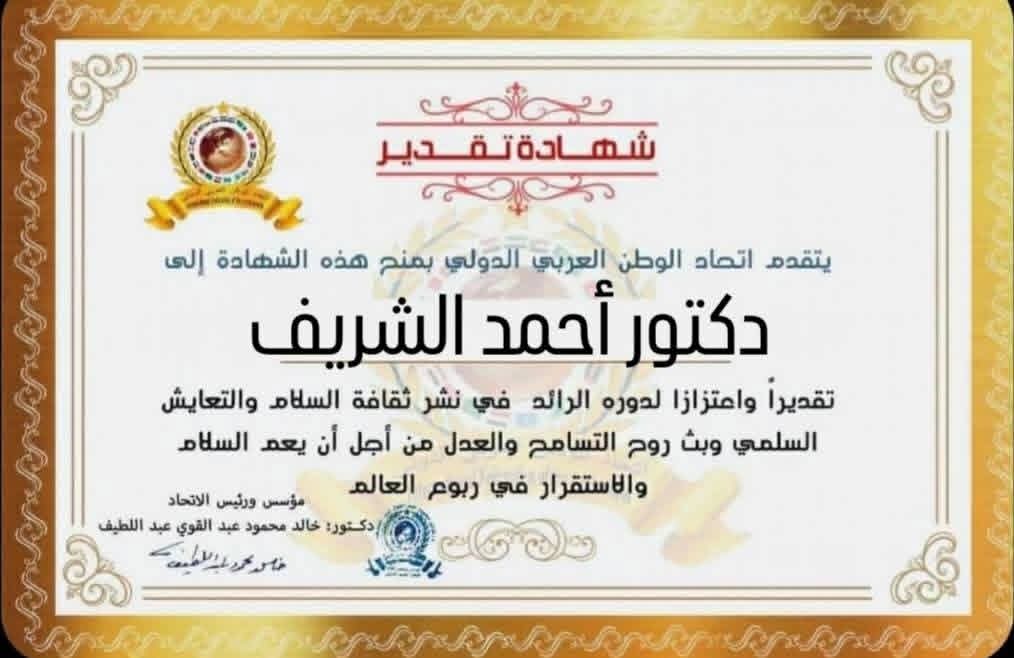 مؤسس ورئيس اتحاد الوطن العربي الدولي يمنح شهادة تقدير للدكتور أحمد الشريف رئيس مجلس أمناء مؤسسة القادة للعلوم الإدارية من جمهورية مصر العربية