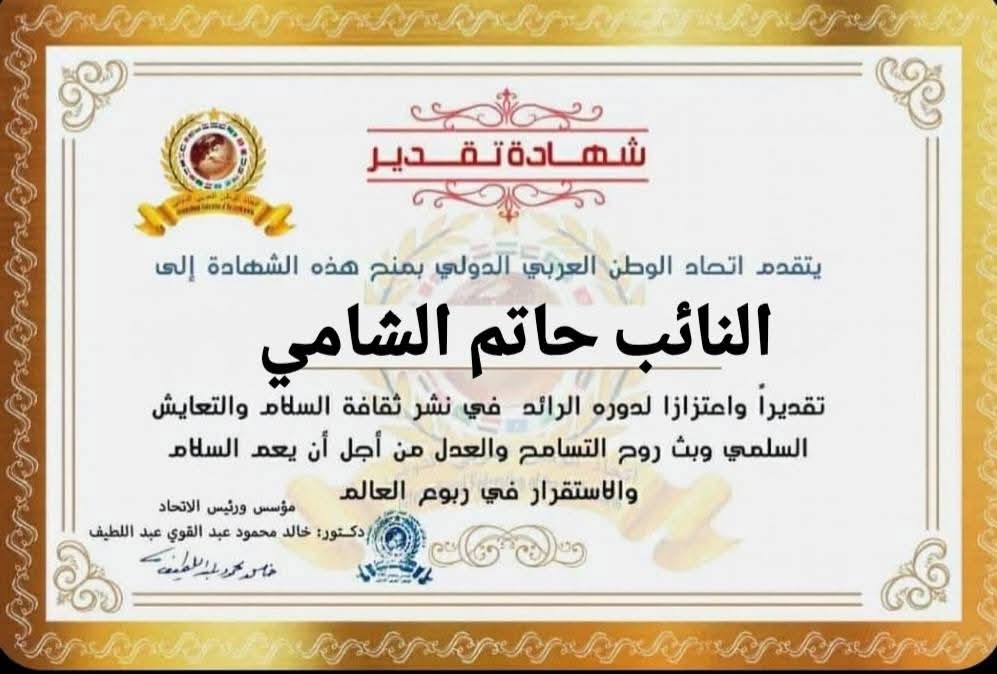 مؤسس ورئيس اتحاد الوطن العربي الدولي يمنح شهادة تقديرللنائب حاتم محمد عبد العزيز محمد الشامي عضو مجلس النوابعن محافظة القاهرة الدائرة الخامسةitihadworld26/12/2025تكريمات