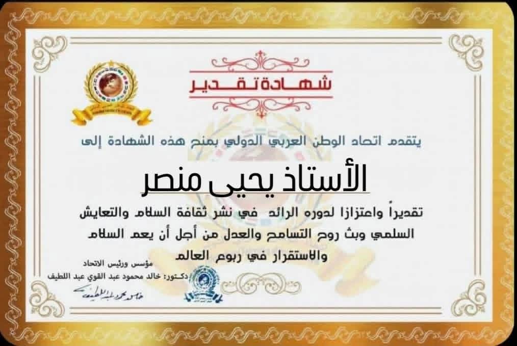 مؤسس ورئيس اتحاد الوطن العربي الدولي يمنح شهادة تقدير للأستاذ يحيى منصر مدير الشؤون الإدارية بالمنظمة العربية للتربية والثقافة والعلوم(ألكسو)itihadworld20/01/2026تكريمات