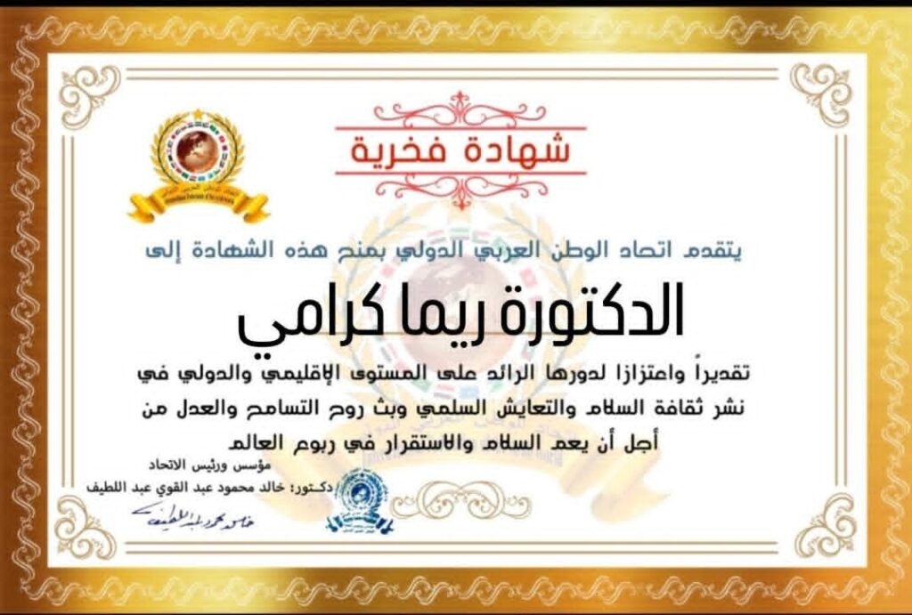 مؤسس ورئيس اتحاد الوطن العربي الدولي يمنح شهادة تقدير للدكتورة ريما كرامي وزيرة التربية والتعليم العالي في الجمهورية اللبنانيةitihadworld21/01/2026تكريمات