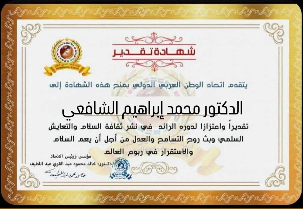 مؤسس ورئيس اتحاد الوطن العربي الدولي يمنح شهادة تقدير للدكتور محمد إبراهيم الشافعي وكيل كلية الحقوق لشؤون التعليم والطلاب جامعة عين شمس بجمهورية مصر العربية