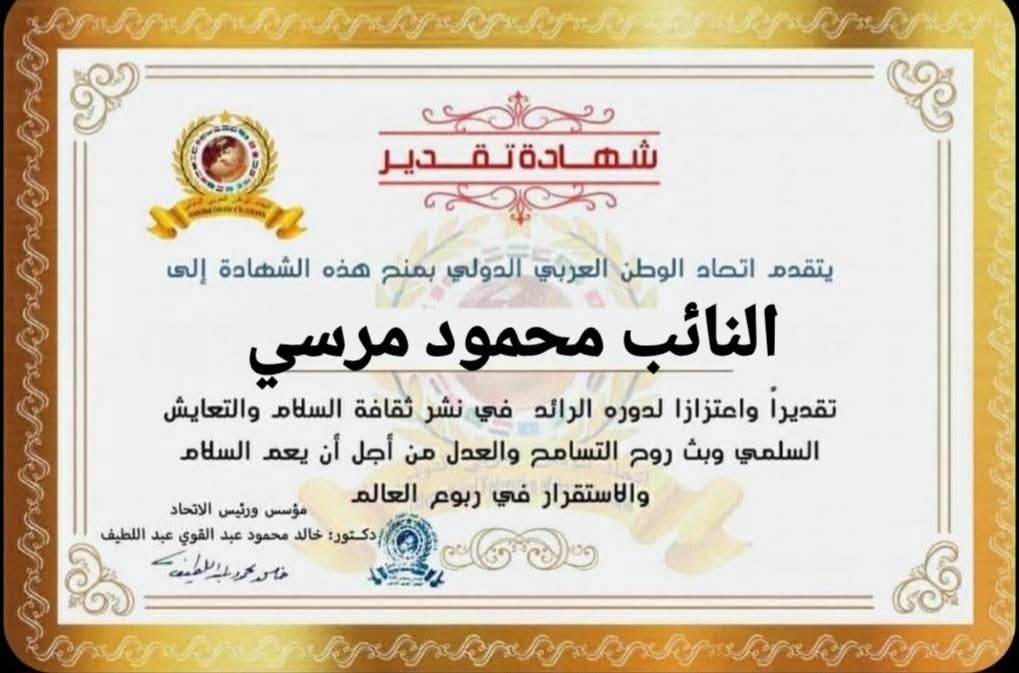 مؤسس ورئيس اتحاد الوطن العربي الدولي يمنح شهادة تقديرللنائب محمود مرسي محمد مرسي عفيفي عضو مجلس النواب عن محافظة القاهرة الدائرة الرابعة