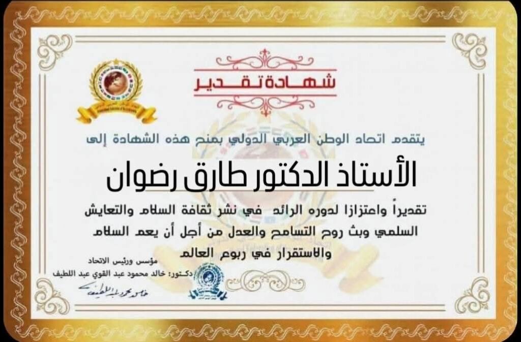 مؤسس ورئيس اتحاد الوطن العربي الدولي يمنح شهادة تقدير للأستاذ الدكتور طارق رضوان وكيل كلية التجارة لشؤون التعليم والطلاب جامعة طنطا بجمهورية مصر العربية