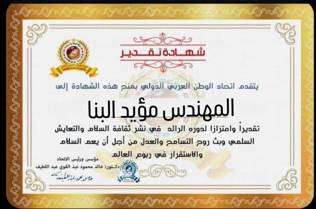 مؤسس ورئيس اتحاد الوطن العربي الدولي يمنح شهادة تقدير للمهندس مؤيد البنا مدير المدن الصناعية في سوريا