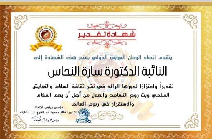 مؤسس ورئيس اتحاد الوطن العربي الدولي يمنح شهادة تقدير للنائبة الدكتورة سارة النحاسitihadworld22/01/2026تكريمات