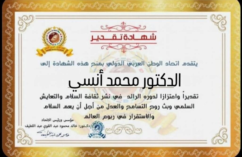 مؤسس ورئيس اتحاد الوطن العربي الدولي يمنح شهادة تقدير للدكتور محمد أنسي نقيب الصيادلة بالإسكندريةitihadworld22/01/2026تكريمات