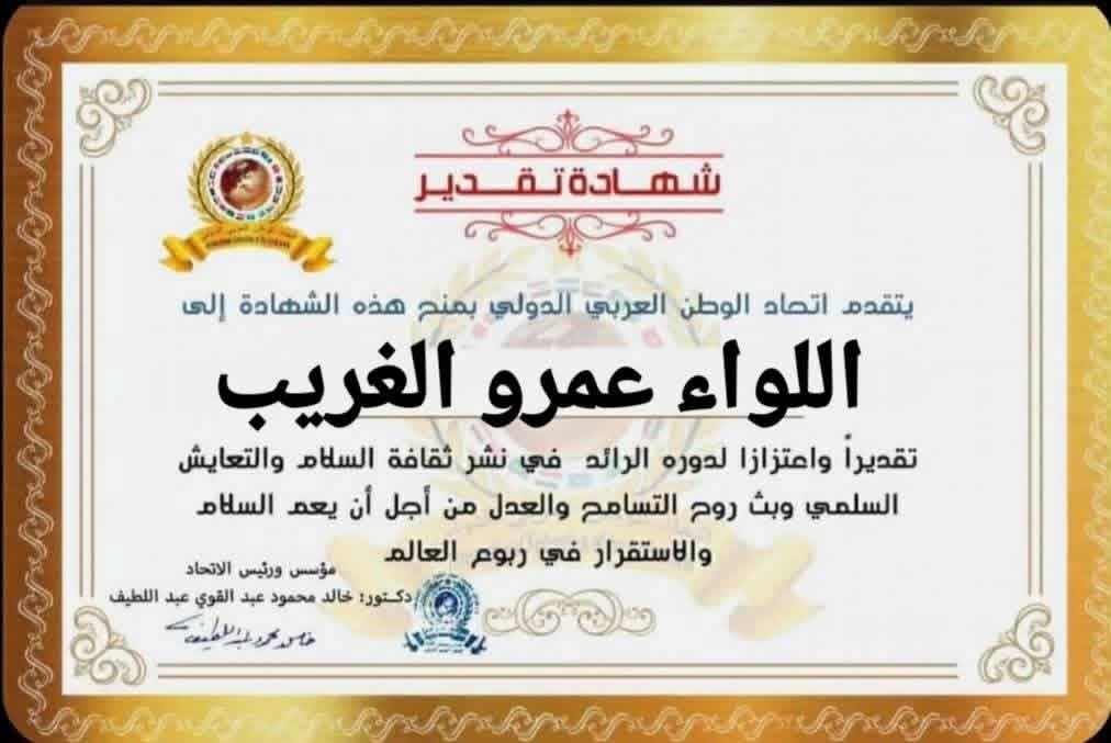 مؤسس ورئيس اتحاد الوطن العربي الدولي يمنح شهادة تقدير للواء عمرو الغربب رئيس هيئة الرقابة الإدارية بالإسكندرية