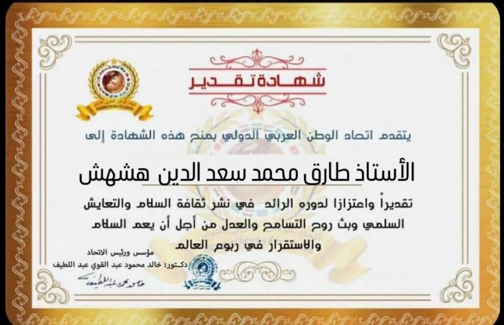 مؤسس ورئيس اتحاد الوطن العربي الدولي يمنح شهادة تقدير للأستاذ طارق محمد سعد الدين هشهش مديرا لمديرية التربية والتعليم بمحافظة قنا بجمهورية مصر العربيةitihadworld22/01/2026تكريمات