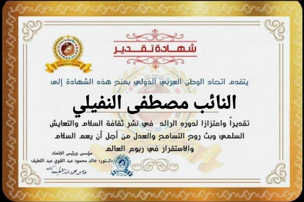 مؤسس ورئيس اتحاد الوطن العربي الدولي يمنح شهادة تقديرللنائب مصطفى بيومي محمد بيومي النفيلي عضو مجلس النوابعن محافظة القاهرة الدائرة الثانيةitihadworld26/12/2025تكريمات