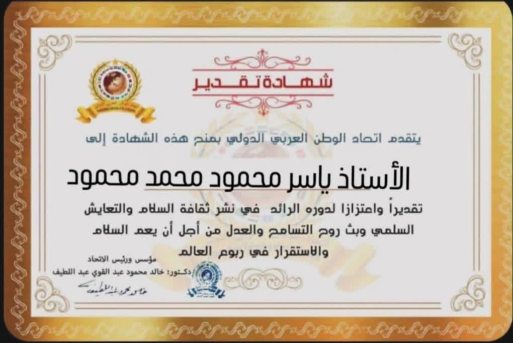 مؤسس ورئيس اتحاد الوطن العربي الدولي يمنح شهادة تقدير للأستاذ ياسر محمود محمد محمود مديرا لمديرية التربية والتعليم بمحافظة المنوفية بجمهورية مصر العربيةitihadworld22/01/2026تكريمات