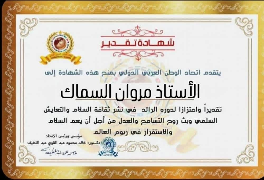 مؤسس ورئيس اتحاد الوطن العربي الدولي يمنح شهادة تقدير للأستاذ مروان السماك ممثل توكيل Hap a g – L i o y ditihadworld23/01/2026تكريمات