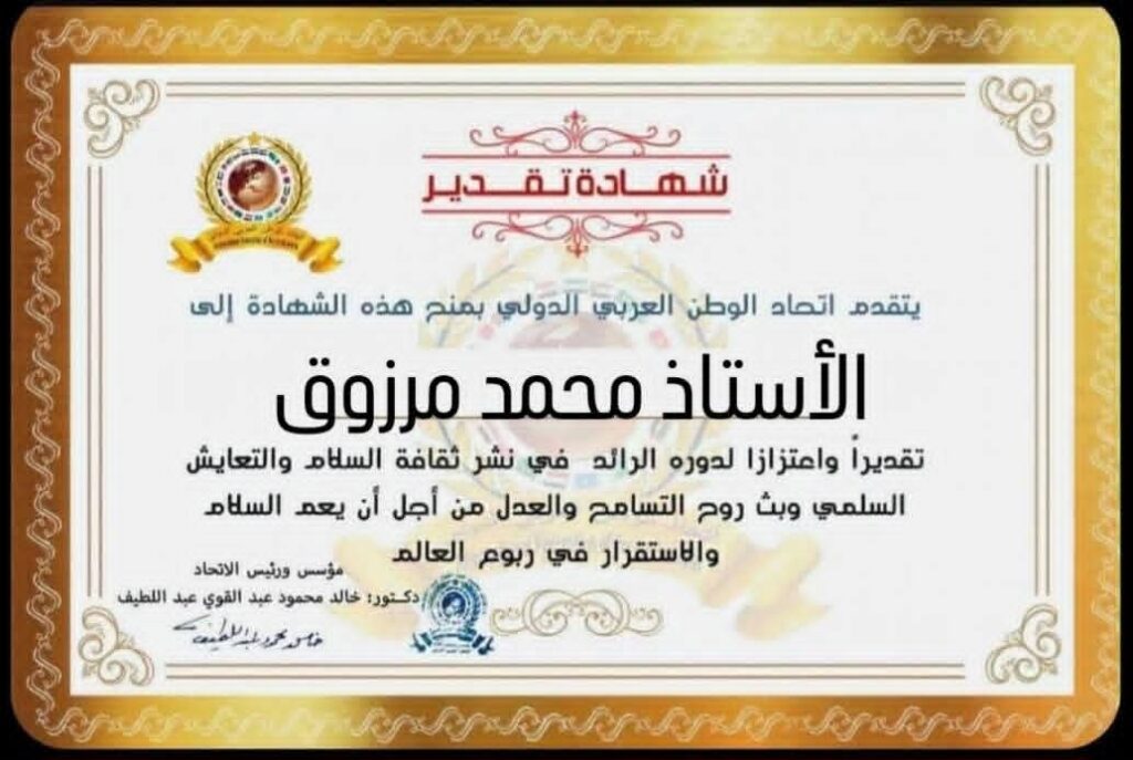 مؤسس ورئيس اتحاد الوطن العربي الدولي يمنح شهادة تقدير للأستاذ محمد مرزوق ممثل توكيل LETHitihadworld23/01/2026تكريمات