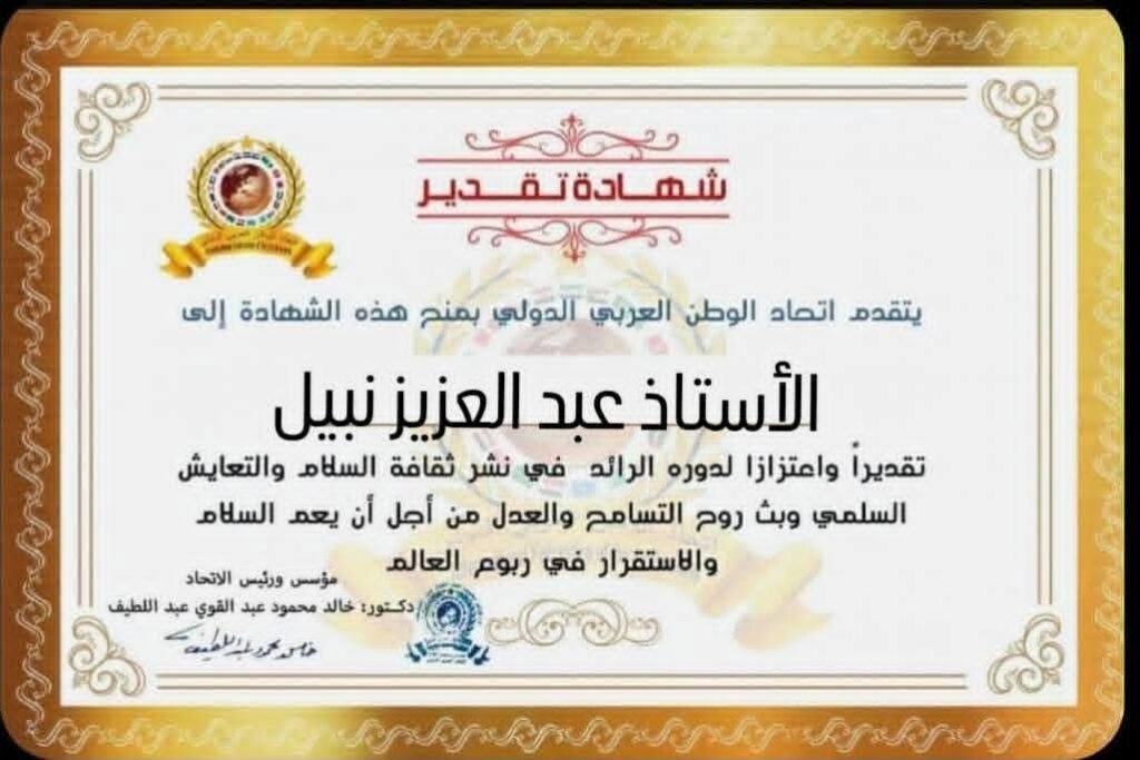مؤسس ورئيس اتحاد الوطن العربي الدولي يمنح شهادة تقدير للأستاذ عبد العزيز نبيل ممثل توكيل Inchcape