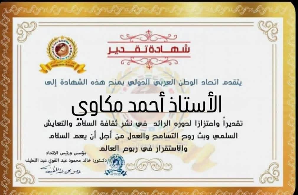 مؤسس ورئيس اتحاد الوطن العربي الدولي يمنح شهادة تقدير للأستاذ أحمد مكاوي ممثل توكيل الخليج للملاحة
