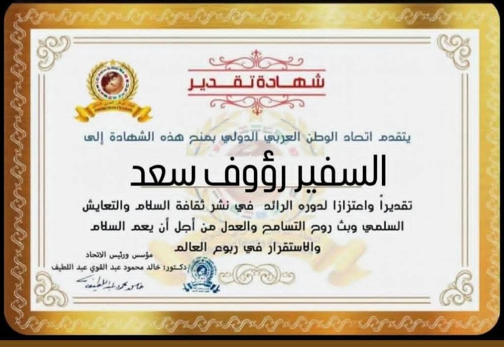 مؤسس ورئيس اتحاد الوطن العربي الدولي يمنح شهادة تقدير للسفير رؤوف سعد مستشار الوزيرة للاتفاقيات متعددة الأطراف بوزارة البيئة بجمهورية مصر العربية