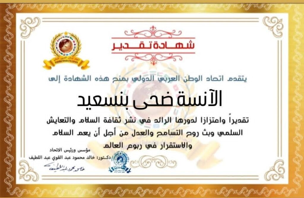 مؤسس ورئيس اتحاد الوطن العربي الدولي يمنح شهادة تقدير للانسة ضحى بنسعيد منسقة بمركز الترجمة والنشر بمنظمة الايسيسكوitihadworld23/01/2026تكريمات