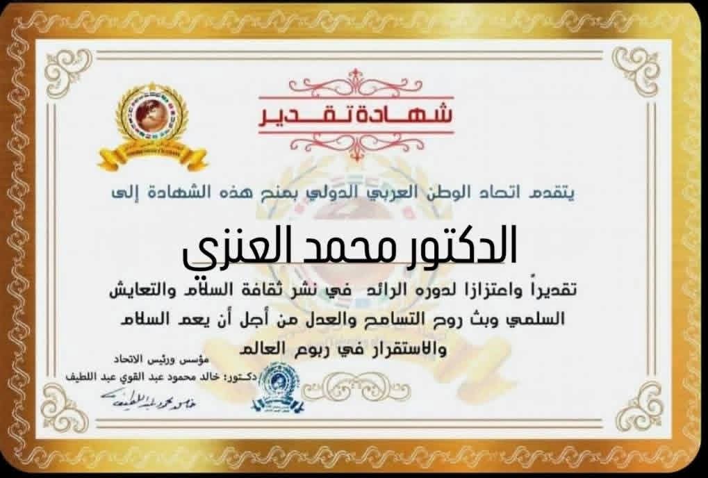 مؤسس ورئيس اتحاد الوطن العربي الدولي يمنح شهادة تقدير للدكتور محمد العنزي رئيس قسم النشر والمكتبة بمنظمة الايسيسكو