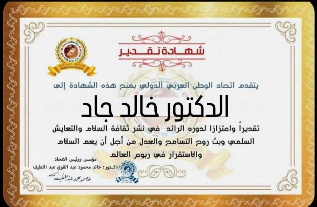 مؤسس ورئيس اتحاد الوطن العربي الدولي يمنح شهادة تقدير للدكتور خالد جاد المتحدث باسم وزارة الزراعة بمركز البحوث الزراعية واستصلاح الأراضي بجمهورية مصر العربيةitihadworld24/01/2026تكريمات