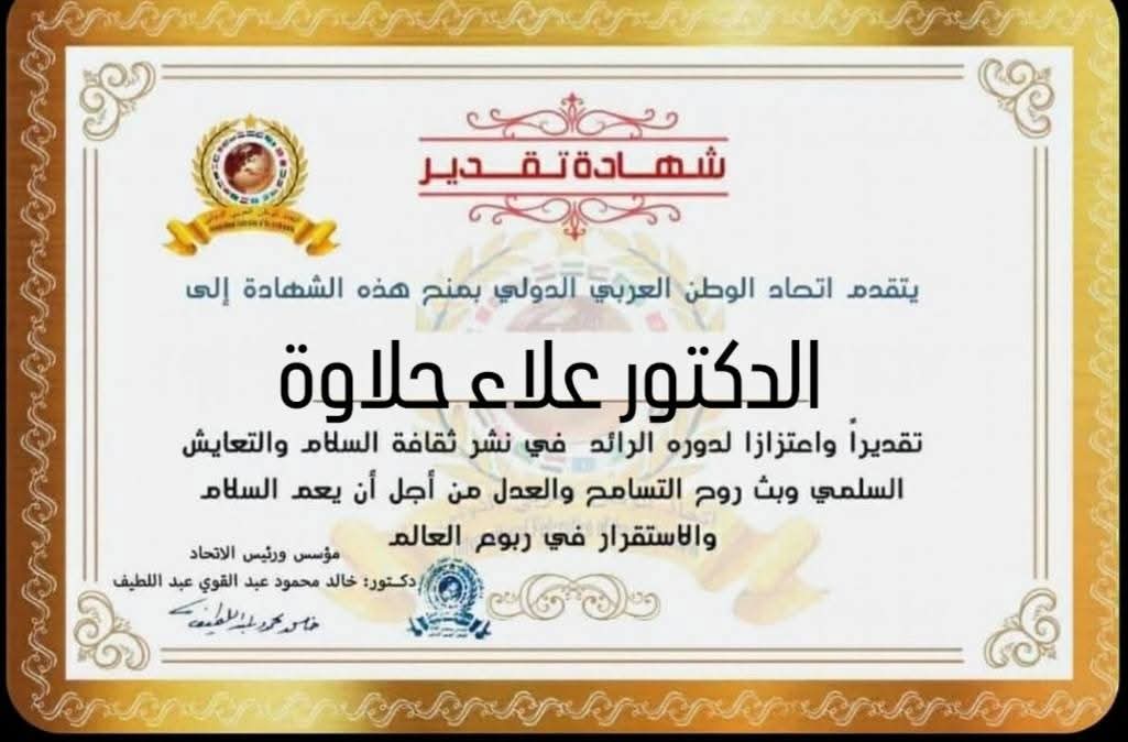 مؤسس ورئيس اتحاد الوطن العربي الدولي يمنح شهادة تقدير للدكتور علاء حلاوة وكيل وزارة الزراعة بالاسماعيليةitihadworld24/01/2026تكريمات