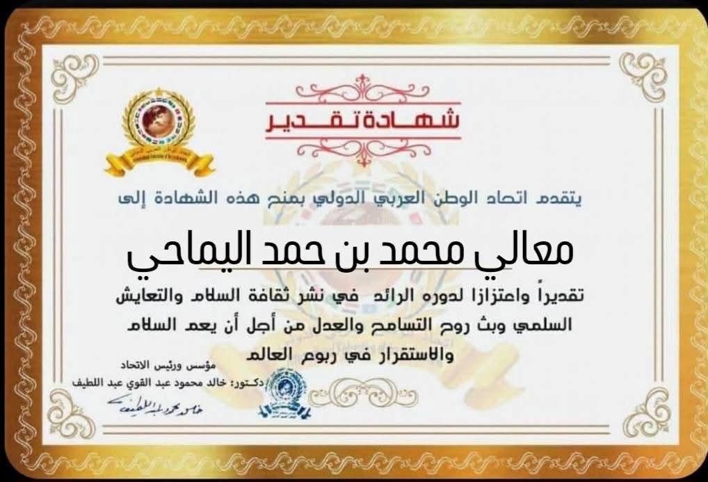 مؤسس ورئيس اتحاد الوطن العربي الدولي يمنح شهادة تقدير لمعالي محمد بن حمد اليماحي رئيس البرلمان العربيitihadworld24/01/2026تكريمات