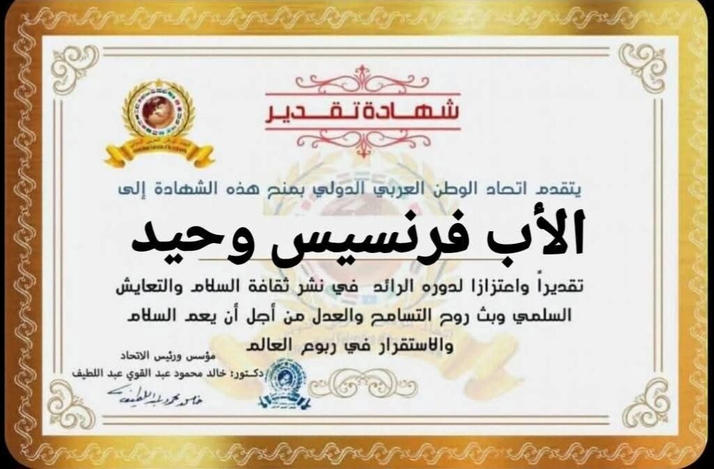 مؤسس ورئيس اتحاد الوطن العربي الدولي يمنح شهادة تقديرللأب فرنسيس وحيد راعي كاتدرائية القيامةitihadworld26/12/2025تكريمات