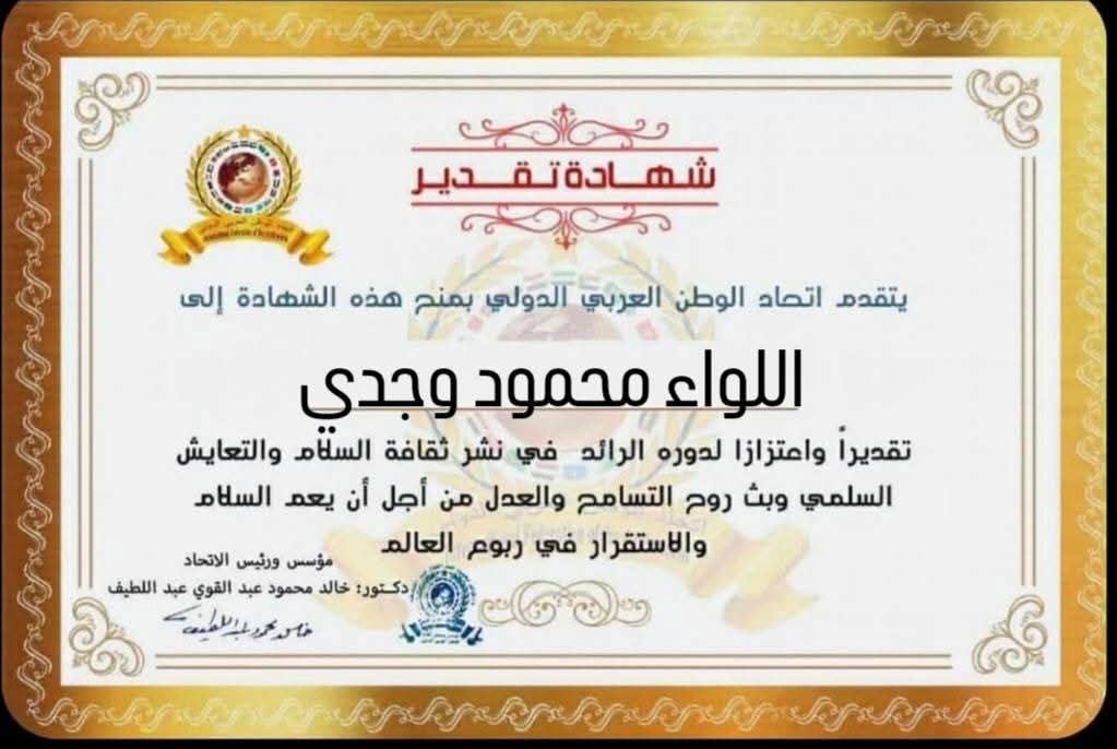 مؤسس ورئيس اتحاد الوطن العربي الدولي يمنح شهادة تقدير للواء محمود وجدي وزير الداخلية الأسبق بجمهورية مصر العربية