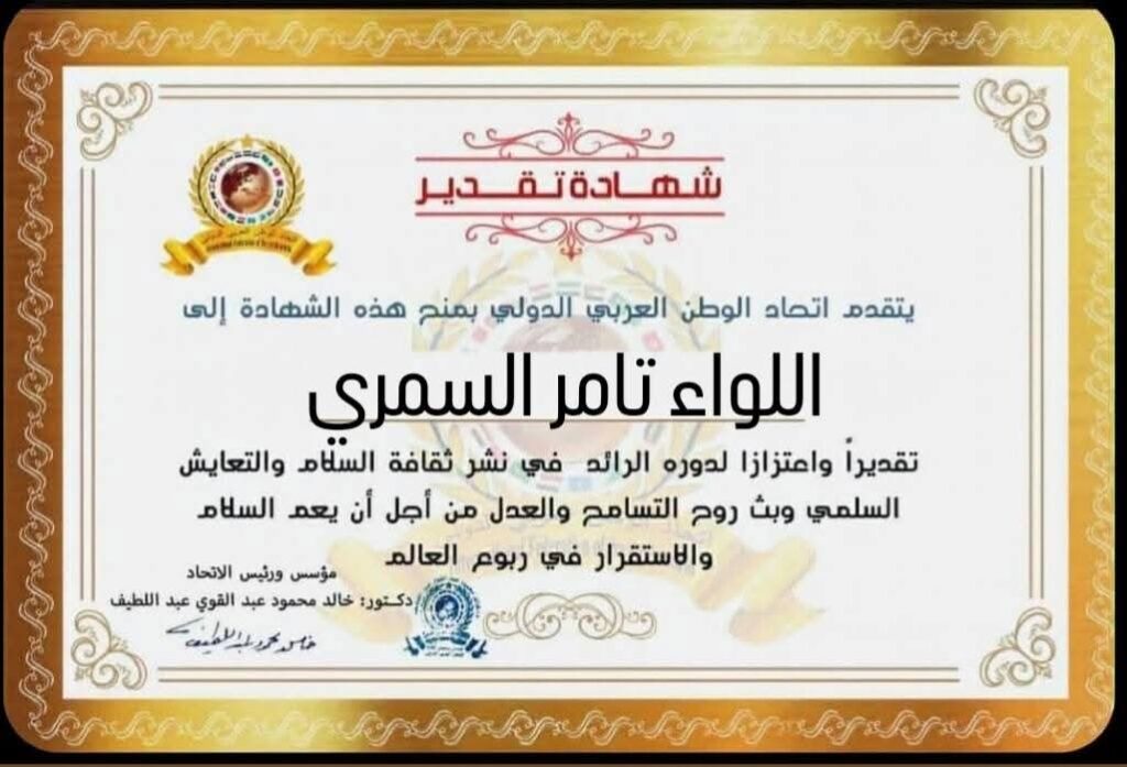 مؤسس ورئيس اتحاد الوطن العربي الدولي يمنح شهادة تقدير للواء تامر السمري مساعد أول وزير الداخلية لمنطقة وسط الدلتاitihadworld25/01/2026تكريمات