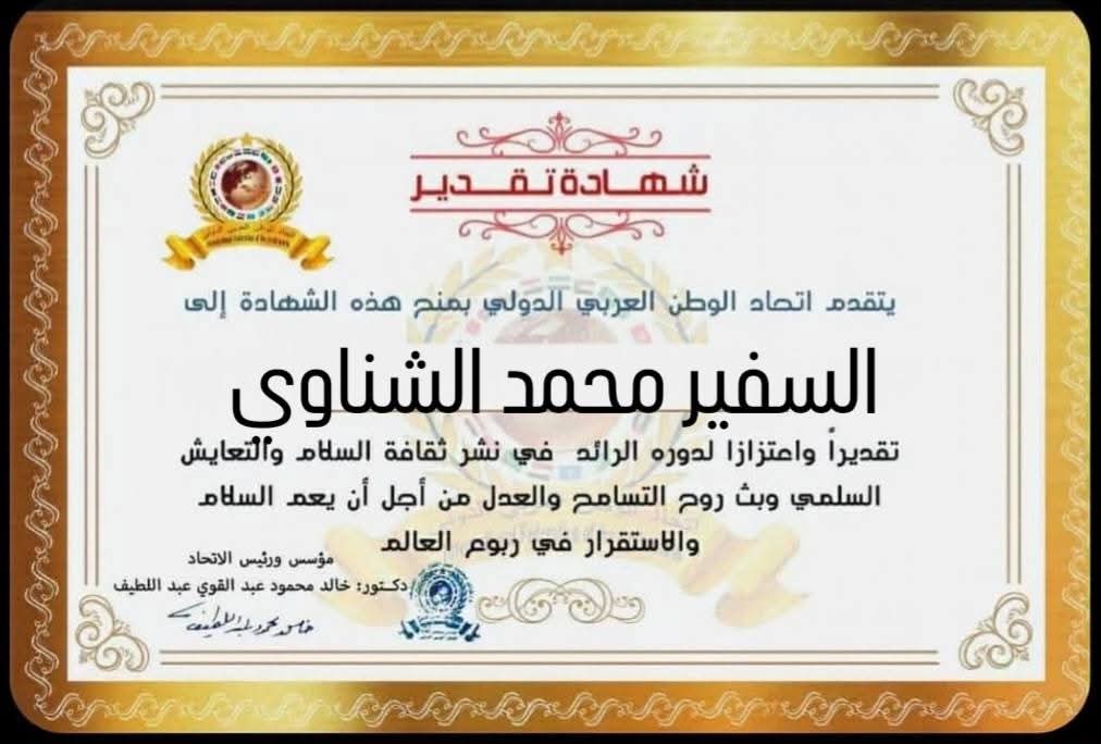 مؤسس ورئيس اتحاد الوطن العربي الدولي يمنح شهادة تقدير للسفير محمد الشناوي المتحدث الرسمي لرئاسة الجمهورية بجمهورية مصر العربية