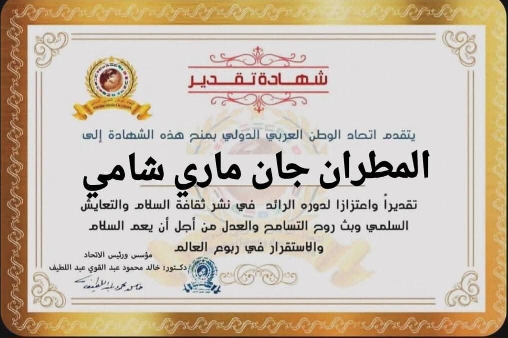 مؤسس ورئيس اتحاد الوطن العربي الدولي يمنح شهادة تقديرللمطران جان ماري شامي نائب ايبارشية مصر والسودان وجنوب السودانitihadworld26/12/2025تكريمات