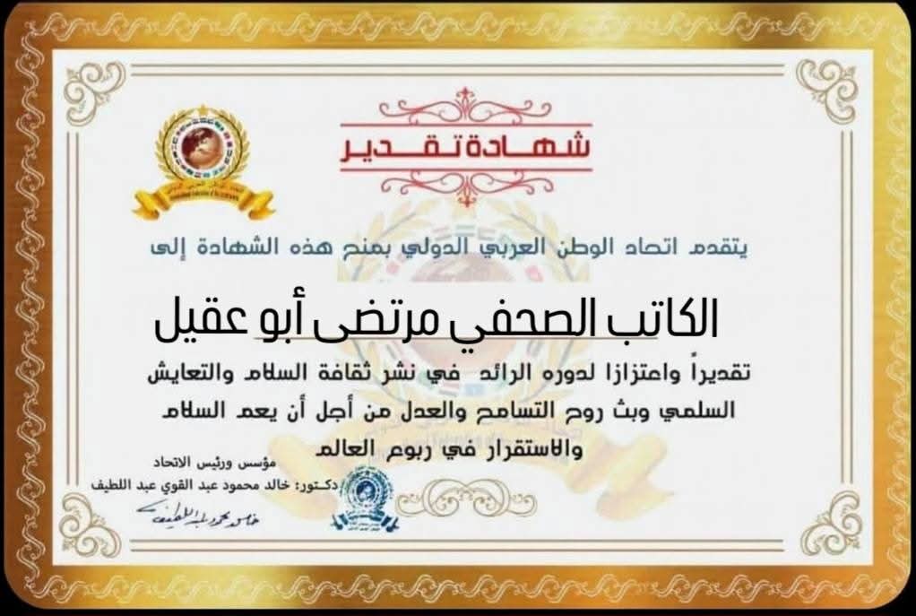 مؤسس ورئيس اتحاد الوطن العربي الدولي يمنح شهادة تقدير للكاتب الصحفي مرتضى أبو عقيل رئيس مجلس إدارة ورئيس تحرير بوابة الجمهورية الجدبدة من جمهورية مصر العربيةitihadworld27/01/2026تكريمات